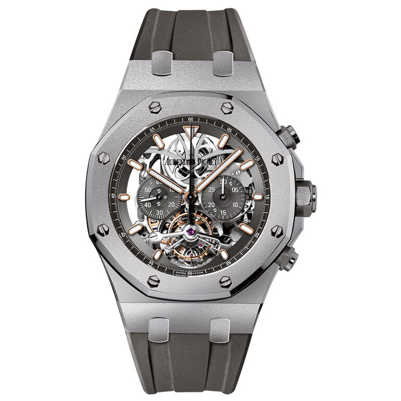 Audemars Piguet Royal Oak Tourbillion Slate Grey Skeleton Dial Mens Watch 26347TI.GG.D004CA.01. Titanium case with a grey rubber strap. Slate grey skeleton dial with rose gold-tone hands and index hour markers. Minute markers around the outer rim. Chronograph - sub-dials displaying: three- 60 seconds, 30 minutes, and tourbillion. Hand Wind movement. Calibre 2936 engine. Scratch resistant sapphire crystal. Screw down crown. Skeleton transparent exhibition see through case back. Case diameter: 44 mm. Case thickness: 13.20 mm. Round case shape. Water resistant at 200 meters / 660 feet. Functions: chronograph, hour, minute, second, tourbillion chronograph, hour, minute, second.