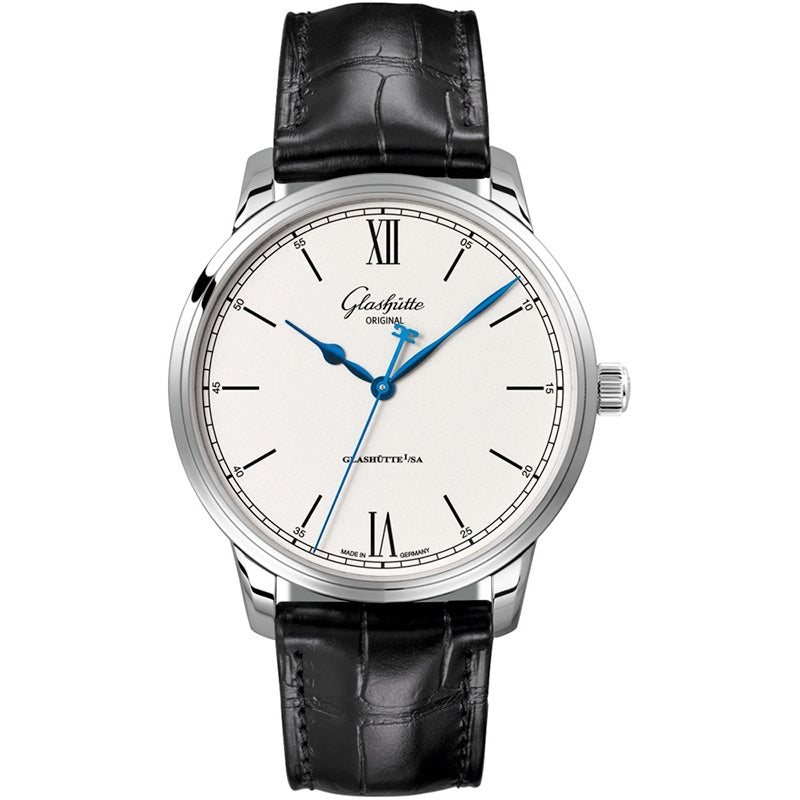 Glashutte Senator Excellence Varnished Silver Dial Automatic Mens Watch 1-36-01-01-02-01. Silver-tone stainless steel case with a black Louisiana alligator leather strap. Fixed bezel. Varnished silver dial with blue hands and index-Roman numerals hour markers. Glashutte Calibre 36-01 automatic movement with a 100-hour power reserve. Scratch resistant sapphire crystal. Transparent case back. Round case shape, case size: 40 mm, case thickness: 10 mm. Buckle clasp. Water resistant at 50 meters / 165 feet.