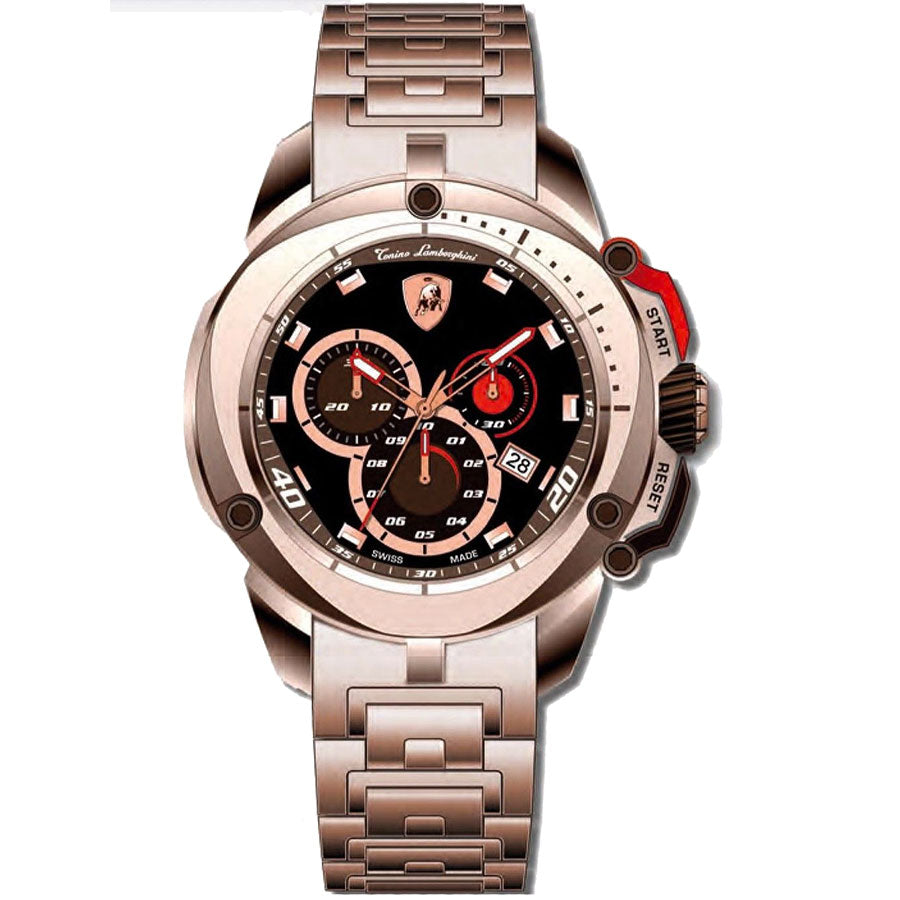 Lamborghini Shield 7800 Chronograph Black Dial Stainess Steel Men's Watch 7805. Rose gold-tone stainless steel case with a rose gold-tone stainless steel bracelet. Fixed stainless steel bezel. Black dial with red and rose gold-tone hands and index hour markers. Minute markers around the outer rim. Chronograph - three sub-dials displaying: 60 second, 30 minute and 1/10th of a second. Quartz movement. Sapphire crystal. Case diameter: 45 mm. Round case shape. Deployment clasp. Water resistant at 100 meters / 330 feet. Functions: chronograph, date, hour, minute, second.