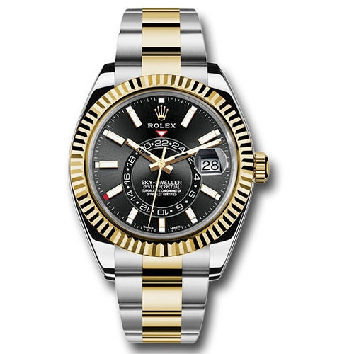 Rolex 336933 bkio Oyster Perpetual Sky-Dweller Watch. This impressive watch features a 42mm yellow Rolesor case made from a combination of Oystersteel and yellow gold, complete with a screw-down back and a screw-down crown that incorporates the Twinlock double waterproofness system. The fluted, bidirectional rotatable Rolex Ring Command bezel surrounds a scratch-resistant sapphire crystal with a cyclops lens over the bright black dial, which showcases index hour markers. Powered by the Rolex calibre 9002, this perpetual self-winding movement offers dual time zones and an annual calendar with center hour, minute, and seconds hands, along with a 24-hour display on an off-center disc. The instantaneous annual calendar is positioned at 3 o'clock and features rapid-setting for both the date and month, displayed through 12 apertures around the dial. With stop-seconds for precise time setting and approximately 72 hours of power reserve, the watch is elegantly paired with an Oyster bracelet featuring three-piece solid links and secured by a folding Oysterclasp buckle with an Easylink 5mm comfort extension link, making it waterproof to 100 meters (330 feet).