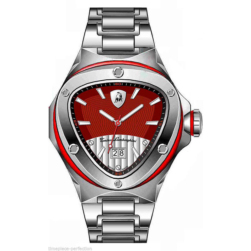 Tonino Lamborghini Spyder 3000 - 3 Hands Red and Silver Dial Men's Watch 3023. Stainless steel case with a stainless steel bracelet. Fixed stainless steel bezel. Red and silver dial with red and silver-tone hands and index hour markers. Lamborghini logo marks the 12 o'clock position. Minute markers around the outer rim. Quartz movement. Scratch resistant sapphire crystal. Solid case back. Case diameter: 53.50 mm. Case thickness: 15.20 mm. Tonneau case shape. Deployment clasp. Water resistant at 100 meters / 330 feet. Functions: date, hour, minute, second.