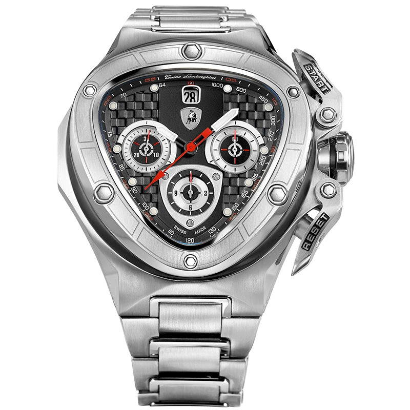 Lamborghini Spyder 8900 8951 Mens Watch. 53mm without crown x 56mm with lugs. CASE Stainless steel polished/satin. BEZEL Stainless steel polished/satin, ss screw polished. ss ring satin PVD-Black. GLASS Mineral glass sapphire coated. CROWN Special crown stainless steel polished. PUSHER Special pusher stainless steel. DIAL Ground black opaque, with squared external surface black. Bague black, number red and line white. 10 index with SPL luminous. Date at 12H. Tonino Lamborghini shield at 12H. HANDS Color white/black/red with SPL luminous. STRAP Stainless steel satin/polished. Buckle deployante with Tonino Lamborghini engraved and shield 3D. MOVEMENT DD 2025 chronograph automatic SWISS MADE. WATERPROOF Guarantee 100 meters/330 ft.