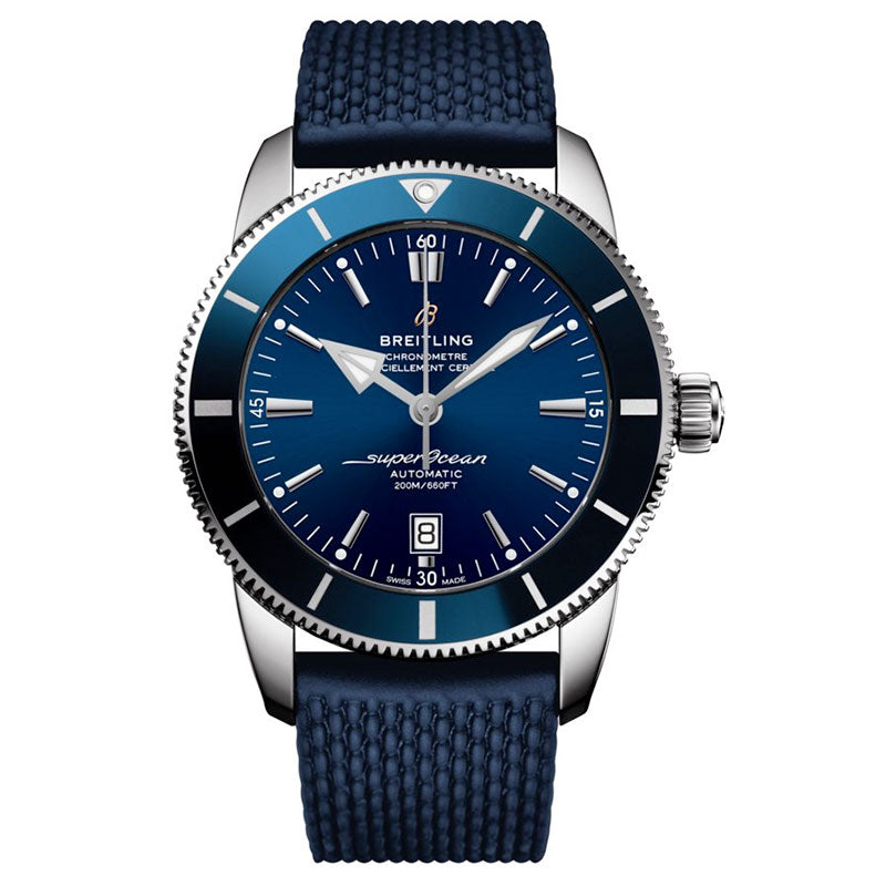 Breitling Superocean Heritage II Automatic Blue Dial Mens Watch AB2020161C1S1. Stainless steel case with a blue (aero classic) rubber strap. Uni-directional rotating stainless steel with a blue ceramic ring bezel. Blue dial with luminous silver-tone hands and index hour markers. Minute markers around the outer rim. Breitling calibre 20 automatic movement with a 70-hour power reserve. Scratch resistant sapphire crystal. Screw down crown. Solid case back. Round case shape. Case size: 46 mm. Case thickness: 15 mm. Band width: 24 mm. Fold over clasp with a push button release. Item Variations: AB202016-C961-276S-A20D.2.
