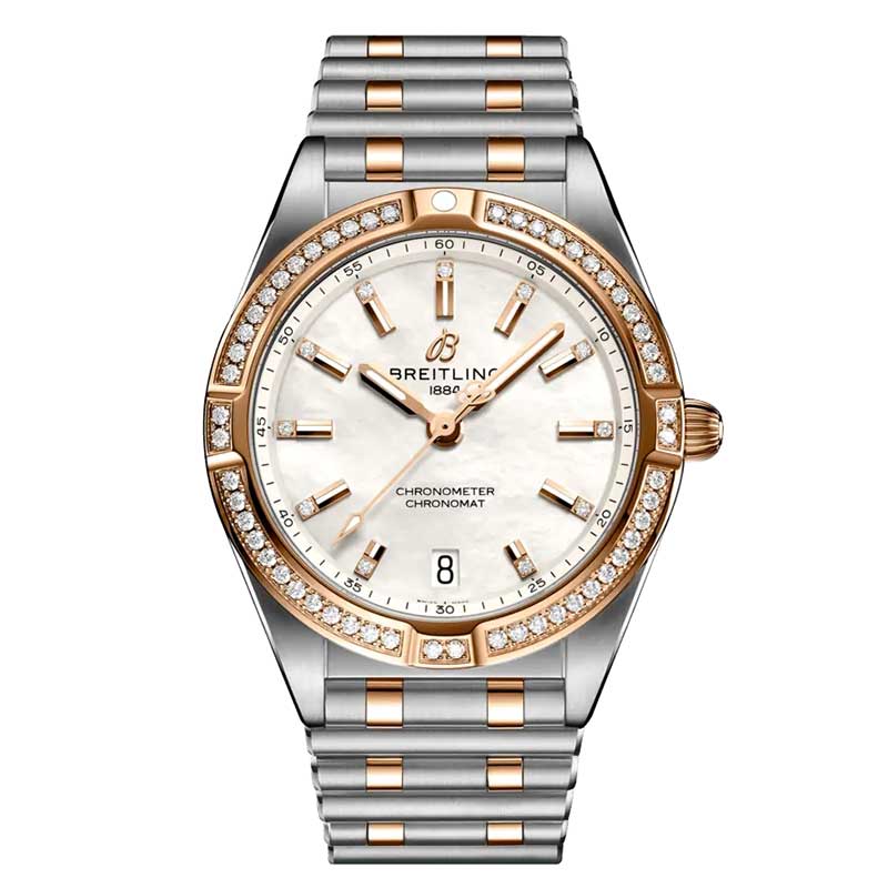 Breitling u77310591a2u1 ladies quartz 32mm watch. This watch showcases a stunning brushed and polished stainless steel and rose gold case and bracelet, with a bezel adorned with 54 dazzling diamonds. The mother of pearl dial adds a touch of elegance, enhanced by the polished rose gold hands and applied index hour markers with luminous fill. Eleven diamond hour markers further elevate the luxury of this timepiece, while the fine printed minute, seconds, and fractions of seconds track ensures precise timekeeping. Complete with a date window at 6 o'clock and powered by the reliable Breitling caliber 77 SuperQuartz movement, this watch seamlessly blends beauty and functionality for a truly exceptional accessory.