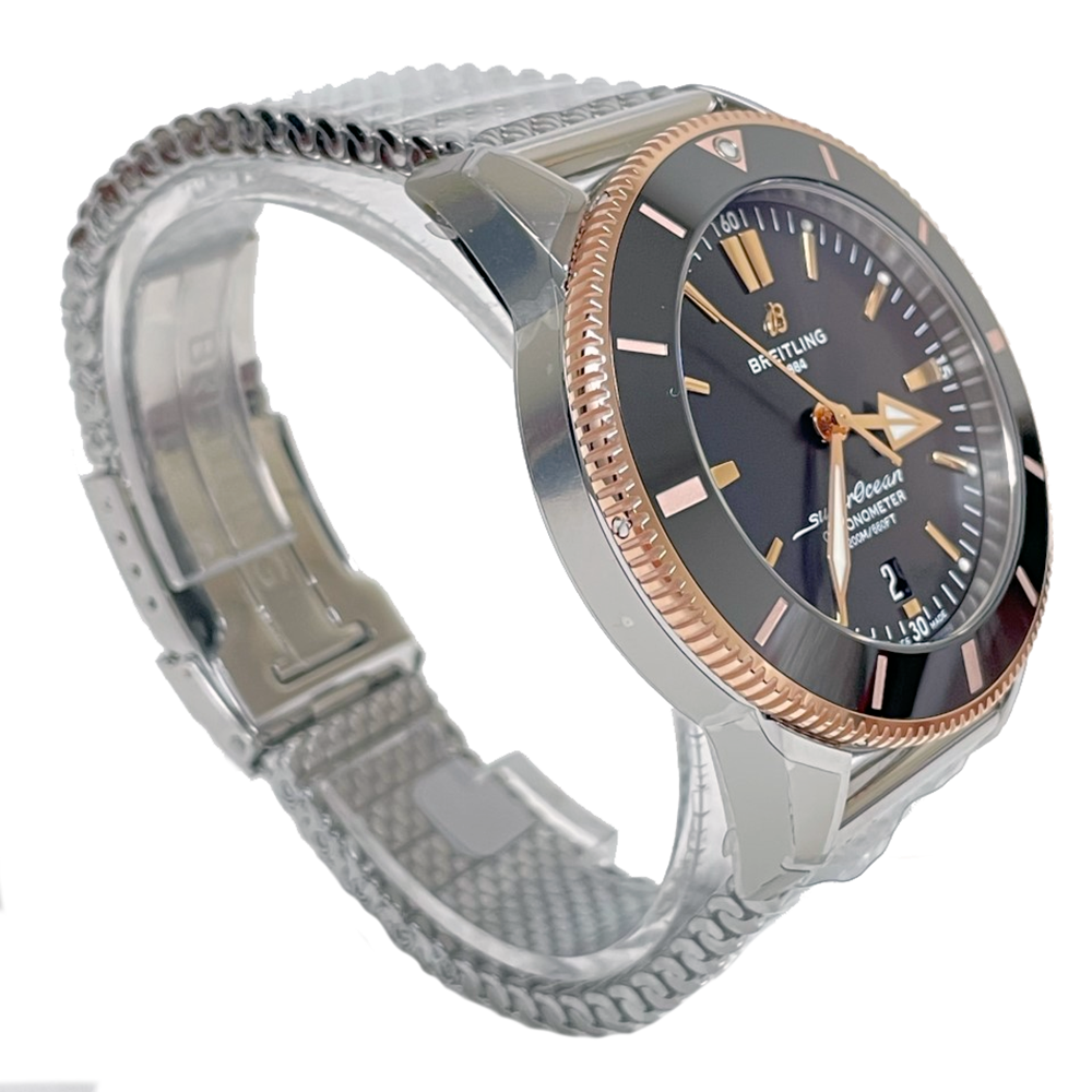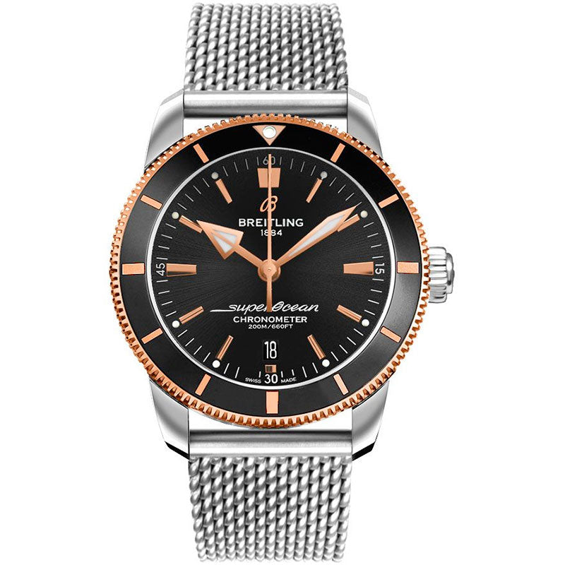 Breitling Superocean Heritage II Automatic Chronometer Black Dial Mens Watch UB2030121B1A1. Stainless steel case with a stainless steel mesh bracelet. Uni-directional rotating 18kt rose gold bezel with black ceramic ring. Black dial with luminous rose gold hands and index hour markers. Minute markers around the outer rim. Breitling calibre 20 automatic movement with a 70-hour power reserve. Scratch resistant sapphire crystal. Screw locked crown. Solid case back. Round case shape. Case size: 44 mm. Case thickness: 14.55 mm. Band width: 22 mm. Fold over clasp with a safety release. Water resistant at 200 meters / 660 feet. Item Variations: UB203012-BG52-154A.