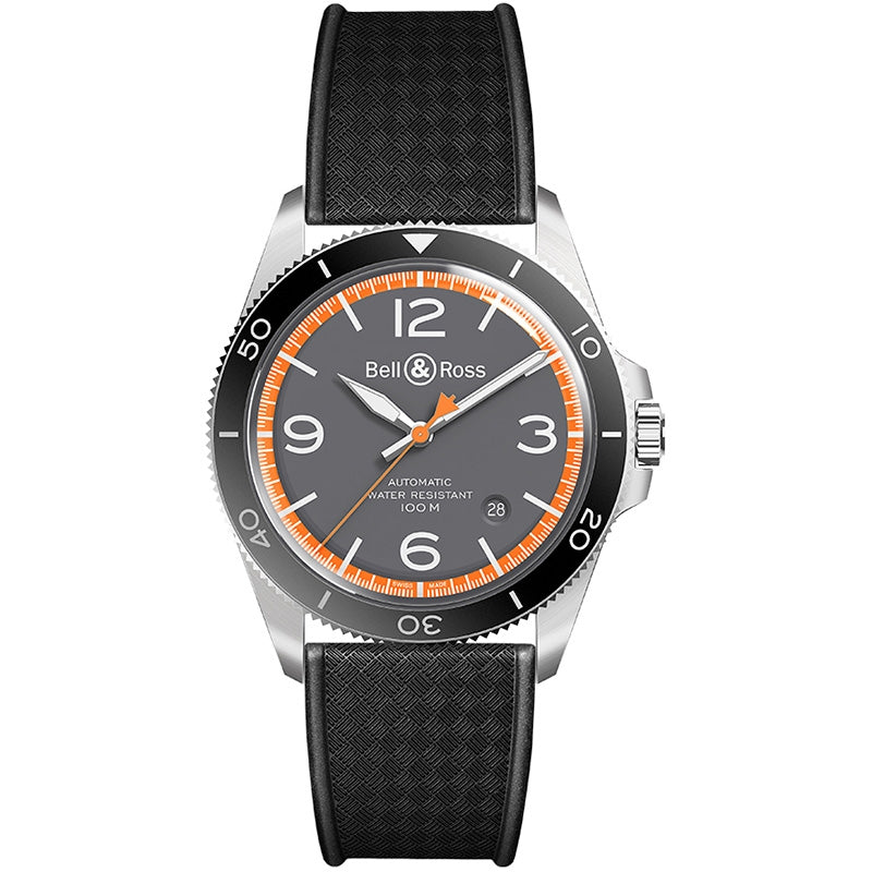 Bell and Ross BRV292-ORA-ST/SRB Vintage BR V2-92 Mens Watch. Stainless steel case. Black aluminum bezel ring. Black dial. White luminous Arabic numerals and index hour markers. Luminous filled hour and minute hands. Displays the date between 4 & 5 o'clock.