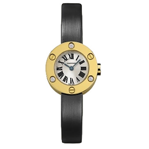 Cartier Love we800831 Ladies Watch. 18K yellow gold case set with six diamonds, Love engraved back, silver sunray dial, quartz Cartier calibre 157 movement, fabric strap with 18K gold tang type buckle. Water resistant to 30 meters.