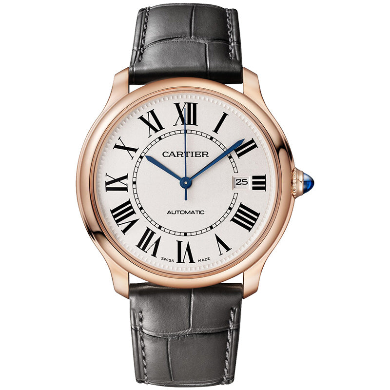 Cartier wgrn0011 Ronde Louis De Cartier Mens 40mm Watch. The 18kt pink gold case of this elegant timepiece is complemented by a matching crown set with a synthetic cabochon. The luxurious gray matt alligator leather strap adds a touch of sophistication, while the beige sandplasted dial provides a unique texture. Black Roman numeral hour markers and blued steel hands complete the classic and refined look of this stunning watch.