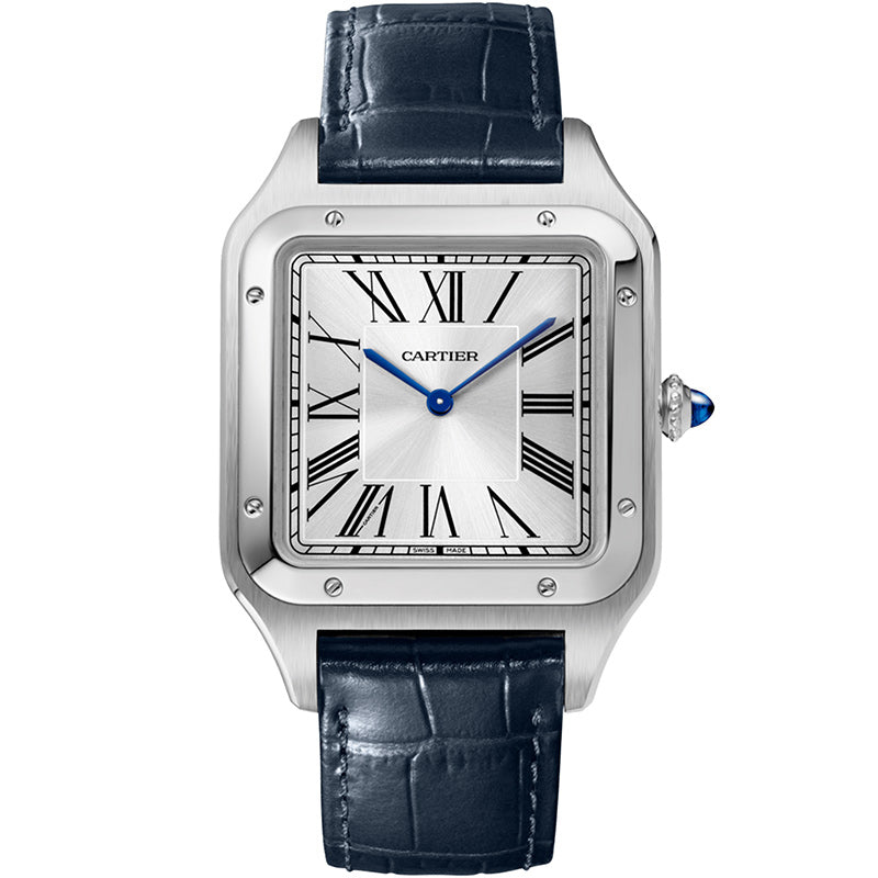Cartier Santos-Dumont Quartz Silver Dial Unisex Watch wssa0032. The watch boasts a brushed and polished stainless steel case with a polished stainless steel bezel. It features a stainless steel beaded crown adorned with a blue synthetic cabochon-shaped spinel. The dial is silver with a fine sun-ray finish, complemented by black printed Roman numeral hour markers and a black printed minute track. To top off the elegant design, the watch is accented with blued steel hands.