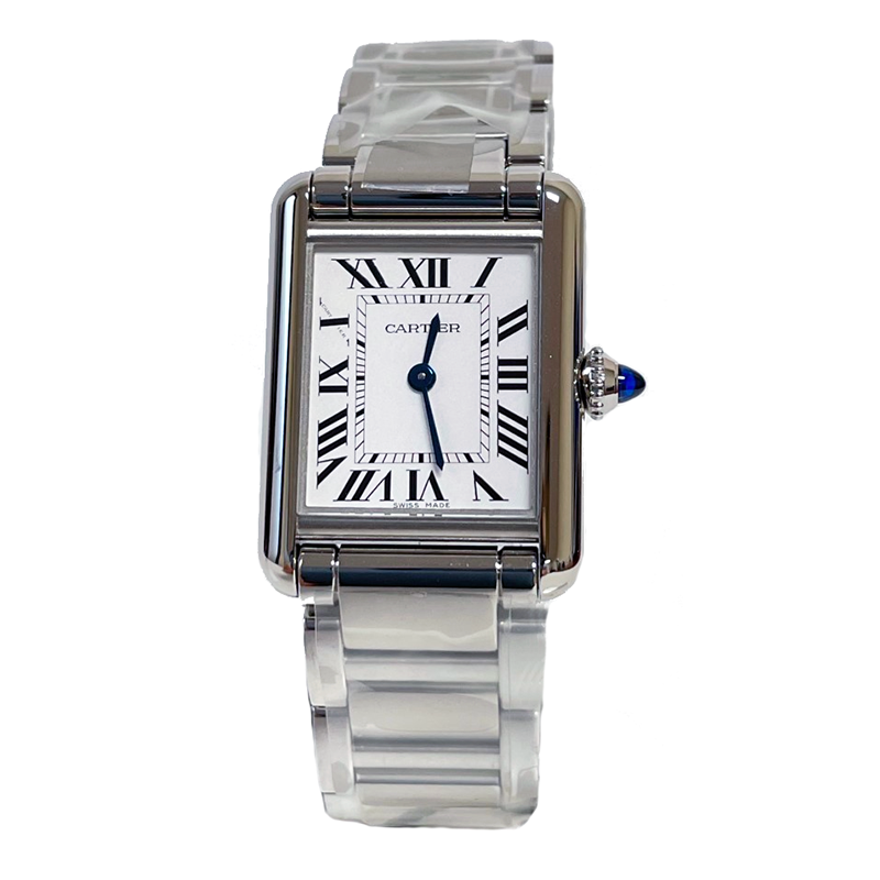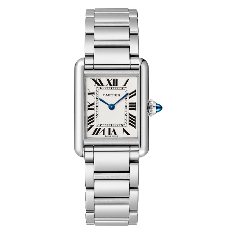 Cartier WSTA0051 Tank Must watch, small model, high autonomy quartz movement. Steel case, beaded crown set with a synthetic cabochon-shaped spinel, silvered dial, blued-steel sword-shaped hands, interchangeable steel bracelet. Case dimensions: 29.5 mm x 22 mm, thickness: 6.6 mm. Water-resistant up to 3 bar (approx. 30 meters/100 feet).