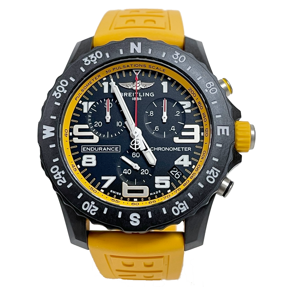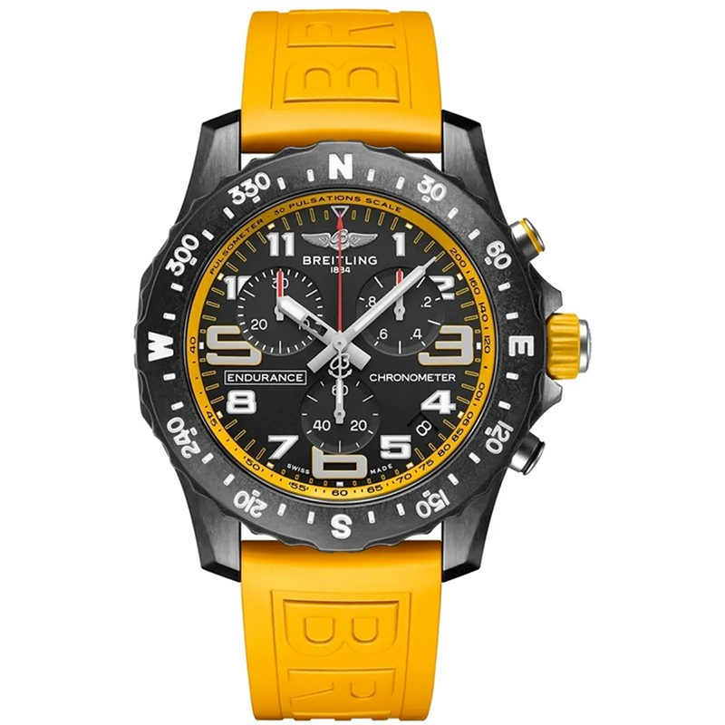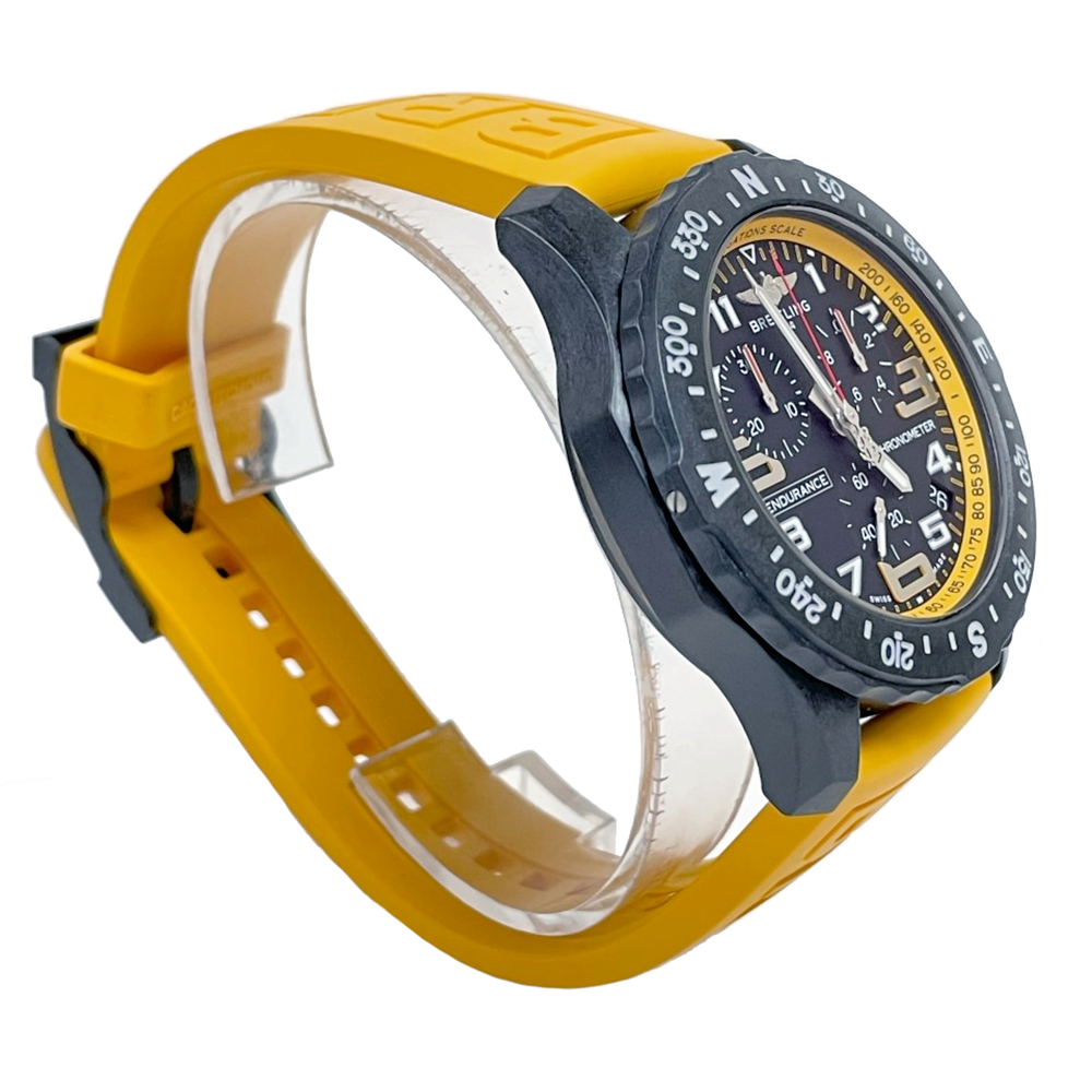 Breitling 82310a41b1s1 Men's Endurance Yellow Watch. Matte black Breitlight case. Exclusive to Breitling, Breitlight is lightweight & resistant to scratches, traction and corrosion. Bi-directional bezel engraved with compass scale. Crown & chronograph button with matching white accents. White dial flange with pulsometer scale. Black dial. Numeral & luminous hour markers. Polished hands, the hour & minute hand with luminous fill. White outlined minute/seconds track on the dial perimeter.