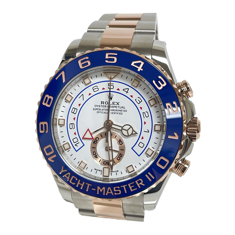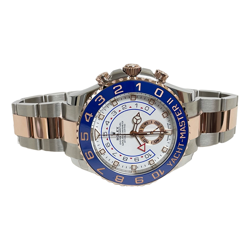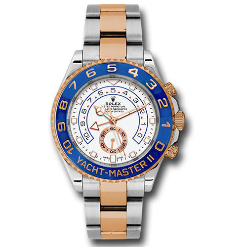 Rolex Yacht-Master II White Dial Stainless Steel and 18K Everose Gold Rolex Oyster Automatic Mens Watch 116681WASO. Stainless steel case with a stainless steel Rolex oyster bracelet with 18kt everose gold center links. Bi-directional rotating 18kt everose gold bezel. White dial with rose gold hands and index hour markers. Minute markers around the outer rim. Rolex calibre 4160 automatic movement with a 72-hour power reserve. Scratch resistant sapphire crystal. Screw down crown. Solid case back. Case size: 44 mm. Round case shape. Oysterlock clasp. Water resistant at 100 meters / 330 feet. Functions: hour, minute, second.