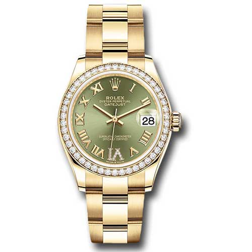 Rolex 278288RBR ogdr6o 31mm 18K yellow gold case, screw-down crown with twinlock double waterproofness system, bezel set with 46 diamonds, scratch-resistant sapphire crystal with cyclops lens over the date, olive green diamond Roman IV dial, Roman numerals with 11 diamonds set on VI, Rolex calibre 2236 automatic movement with center hour, minute and seconds hands, instantaneous date with rapid setting, and stop-seconds for precise time setting, approximately 55 hours of power reserve, 18K yellow gold Oyster bracelet with flat three-piece links, concealed folding Crownclasp buckle.