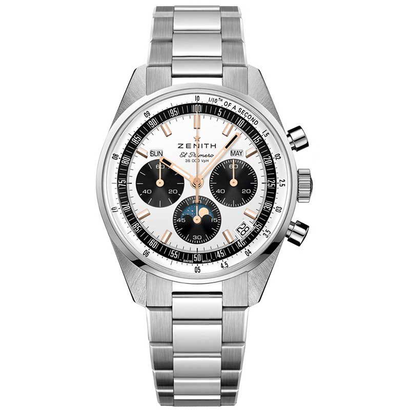 Zenith Chronomaster Original 38mm Men's Watch 03.3400.3610/38.M3200. This sophisticated watch features a brushed and polished stainless steel case with a striking silver dial, enhanced by applied luminous markers and hands for excellent visibility. The silver dial flange complements the design, while a sub-dial at 9 o'clock indicates seconds and a date window is conveniently positioned at 4:30. Powered by the Zenith Caliber El Primero 3610, this timepiece operates at an impressive 5Hz (36,000 vibrations per hour) and offers a power reserve of 60 hours (3 days). It includes a chronograph function with a large central 1/10th of a second counter hand that makes a complete revolution every 10 seconds, along with 60-second and 60-minute counter sub-dials at 3 and 6 o'clock, respectively. Additionally, the watch features a moonphase display and a triple calendar function, which shows the day, date, month, and moonphase, seamlessly combining style and functionality.