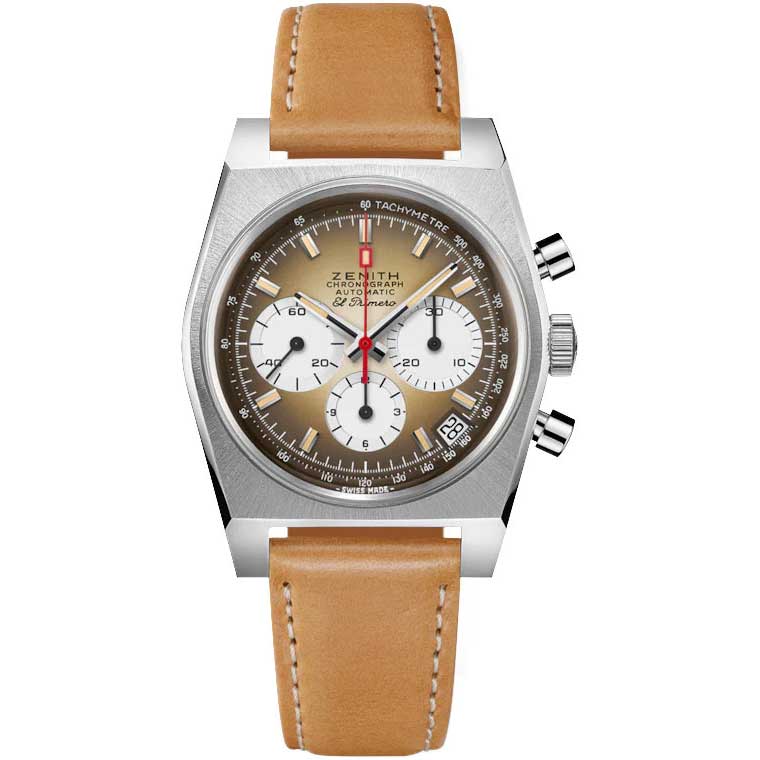 Zenith Chronomaster Revival El Primero 37mm 03.a384.400/385.c855. The Chronomaster El Primero A384 Revival is a stunning tribute to the original A384 from 1969, showcasing a design that carefully embraces its heritage. This model features a brushed stainless steel case complemented by polished beveled corners and lugs for a refined touch. The brown gradient dial is beautifully accented by silver sub-dials, while the brown dial flange includes a tachymeter scale for added functionality. Polished hour and minute hands, filled with luminous material, enhance visibility, and applied polished index hour markers with luminous fill add elegance to the overall look. Fine printed minutes and seconds scales provide additional precision, and the small seconds sub-dial is positioned at 9 o'clock. A date window can be found between 4 and 5 o'clock for practicality. The chronograph function boasts a large red central seconds counter hand, a 30-minute counter sub-dial at 3 o'clock, and a 12-hour counter sub-dial at 9 o'clock. At its heart lies the Zenith caliber El Primero 400, which beats at an impressive 36,600 vibrations per hour (5Hz), contains 31 jewels, and offers an approximate power reserve of 50 hours, making it a perfect blend of style and high-performance horology.