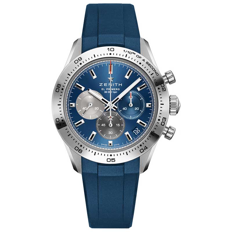 Zenith 03.3114.3600/51.R950 41mm Men's Chronograph Watch. This elegant watch features a brushed and polished stainless steel case paired with a fixed polished bezel that incorporates a 1/10th of a second track. The blue sunray dial is enhanced by tri-colored sub-dials, adding a vibrant and dynamic touch. Applied luminous markers ensure clarity in various lighting conditions, while the luminous hour and minute hands provide excellent visibility. A sub-dial at 9 o'clock is dedicated to tracking seconds, and a convenient date window is located at 4:30. The chronograph functionality, powered by the Zenith Caliber El Primero 3600, utilizes a column-wheel mechanism that accurately measures up to 1/10th of a second, featuring a large central counter hand that completes a full revolution every 10 seconds, alongside a 60-seconds counter sub-dial at 3 o'clock and a 60-minutes counter sub-dial at 6 o'clock. This watch combines precision and style, making it a perfect choice for horology enthusiasts.