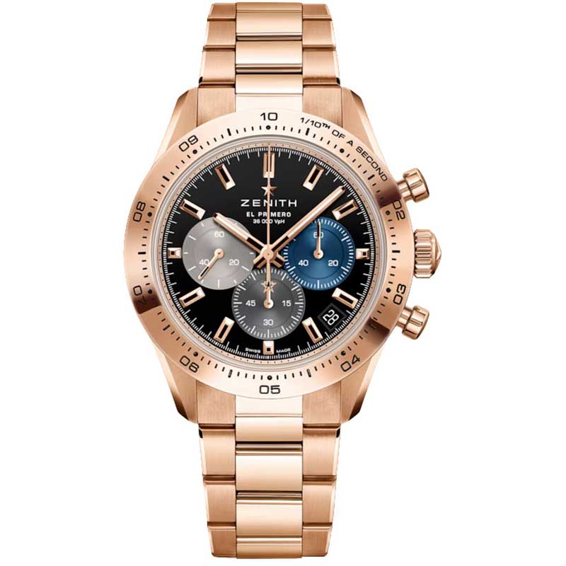 Zenith 18.3101.3600/69.M3100 41mm Men's Chronograph Watch. This luxurious watch features a brushed and polished 18kt rose gold case and bracelet, highlighted by an 18kt rose gold polished bezel with a 1/10th of a second track. The elegant black dial showcases tri-colored sub-dials and polished hands, with the hour and minute hands filled with luminous material for visibility. Applied faceted polished index hour markers with luminous tips enhance clarity, while a small seconds sub-dial at 9 o'clock and a date window at 4:30 add practicality. The chronograph function operates with a reliable column-wheel mechanism, capable of measuring up to 1/10th of a second, featuring a large central counter hand that completes a full revolution every 10 seconds, alongside a 60-seconds counter at 3 o'clock and a 60-minutes counter at 6 o'clock. Powered by the Zenith Caliber El Primero 3600, this timepiece operates at 36,600 vibrations per hour (5Hz), contains 35 jewels, and boasts a power reserve of approximately 60 hours, combining exceptional craftsmanship with sophisticated design.
