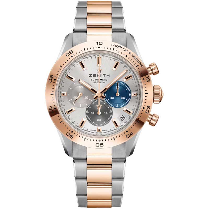 Zenith 3100.3600/69.M3100 41mm Men's Chronograph Watch. This exquisite watch features a brushed and polished case crafted from 18kt rose gold and stainless steel, accented by a polished 18kt rose gold bezel with a 1/10th of a second track. The silver dial showcases tri-colored sub-dials and polished hands, with the hour and minute hands filled with luminous material for enhanced visibility. Applied faceted polished index hour markers with luminous tips further elevate the design. A running small seconds sub-dial is located at 9 o'clock, and a date window is positioned at 4:30. The chronograph function employs a reliable column-wheel mechanism, measuring up to 1/10th of a second and featuring a large central counter hand that completes a full revolution every 10 seconds, along with a 60-seconds counter sub-dial at 3 o'clock and a 60-minutes counter sub-dial at 6 o'clock. Powered by the Zenith Caliber El Primero 3600, this timepiece operates at 36,600 vibrations per hour (5Hz), contains 35 jewels, and boasts a power reserve of approximately 60 hours, making it a perfect blend of luxury and precision.