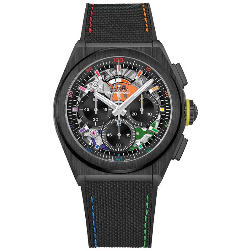 Zenith Defy El Primero 21 Chronograph Automatic Men's Watch 49.9013.9004/21.R952. The DEFY 21 CHROMA II is a limited edition timepiece, with only 500 pieces available, featuring a striking black ceramic case and a captivating skeleton dial that showcases its rainbow-colored movement. The watch includes black sub-dials and a black dial rim for a sleek look, complemented by faceted ruthenium-plated hands with luminous fill and colorful luminous index hour markers. Its renowned El Primero chronograph function boasts a large central 1/100th of a second counter hand, marked by the Zenith star logo, which completes a revolution every second, along with a 60-seconds sub-dial at 6 o'clock, a 30-minutes counter at 3 o'clock, and a running seconds sub-dial at 9 o'clock. A power reserve indicator is conveniently located below the 12 o'clock position. Powered by the Zenith El Primero Caliber 9004, this timepiece operates at 36,600 vibrations per hour, contains 53 jewels, includes 293 components, and offers an approximate power reserve of 50 hours, making it a remarkable blend of artistry and precision.