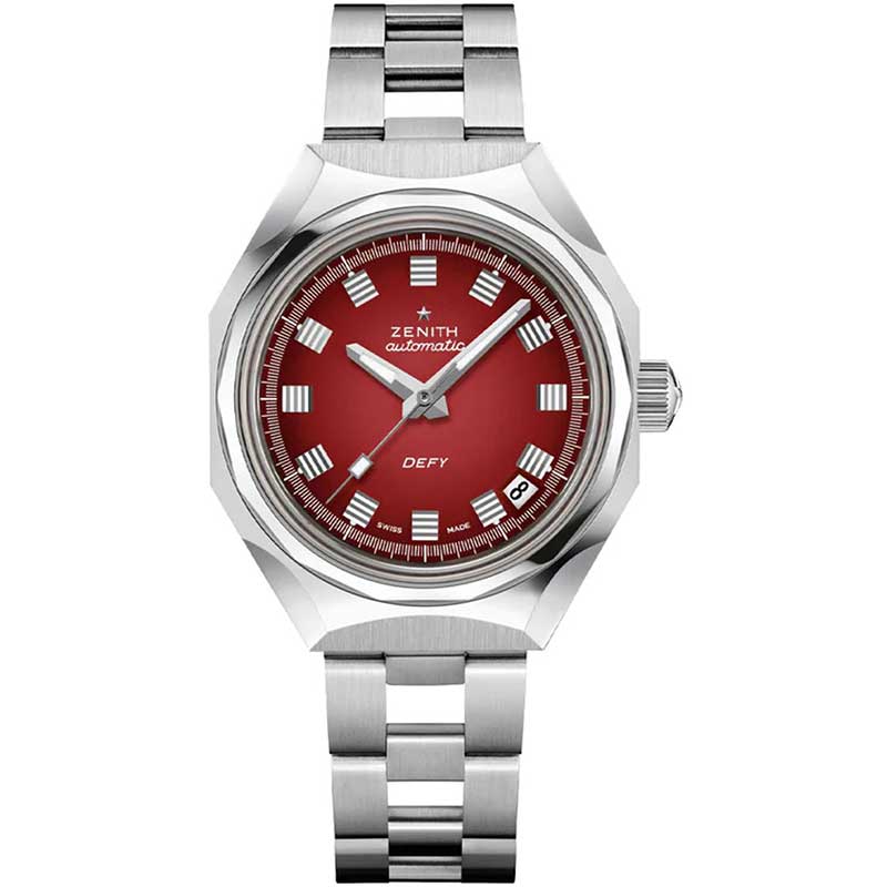 Zenith Defy Revival 37mm Ladies Watch 03.a3642.670/3691.m3642. This striking watch showcases a stainless steel octagonal case with a unique 14-sided bezel, emphasizing its modern aesthetic. The deep red gradient dial adds a dramatic touch, beautifully complemented by rhodium-plated hour markers that enhance its sophisticated look. Rhodium-plated faceted hands, filled with luminous material, ensure excellent visibility in low light. A date display is conveniently positioned between the 4 and 5 o’clock markers for practicality. Powered by the Zenith Elite 670 movement, this timepiece operates at 28,800 vibrations per hour, is composed of 144 components, contains 27 jewels, and boasts an approximate power reserve of 50 hours, making it a remarkable combination of craftsmanship and style.
