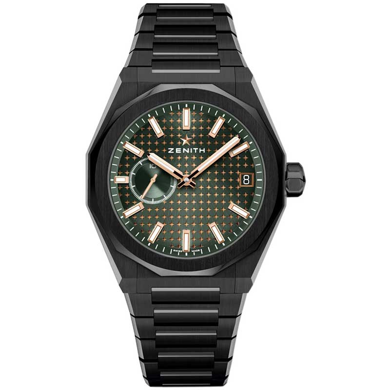 Zenith Defy Skyline 41mm Men's Watch 49.9308.3620/56.I001. This striking watch features a brushed black ceramic case and a fixed brushed and polished faceted bezel, creating a sleek and modern profile. The green sunray dial is beautifully accented with a rose gold-toned engraved pattern, adding depth to its design. Applied index hour markers filled with luminous material enhance readability, complemented by luminous hands for optimal visibility in low light. A sub-dial at 9 o'clock functions as a 1/10th of a second indicator, making a full revolution every 10 seconds, while a convenient date window is positioned at 3 o'clock. The watch includes a green rubber strap for a sporty touch. Powered by the Zenith Caliber El Primero 3620, it operates at 5Hz (36,000 vibrations per hour) and boasts an impressive power reserve of 60 hours (3 days), making it a perfect blend of style and precision.