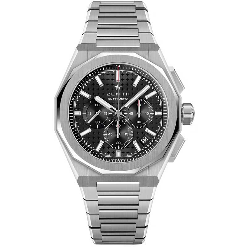 Zenith Defy Skyline Chronograph 42mm Men's Watch 03.9500.3600/21.I001. This sophisticated watch features a brushed and polished stainless steel case paired with a fixed, faceted bezel that combines brushed and polished finishes. The striking black sunray patterned dial is highlighted by applied luminous markers and hands for optimal visibility. A blue dial flange with a seconds track complements the design, and a small seconds hand is found in a sub-dial at 9 o'clock, with a date window conveniently positioned at 4:30. The chronograph function boasts a reliable column-wheel mechanism that measures up to 1/10th of a second, featuring a large central counter hand that completes a full revolution every 10 seconds, along with a 60-seconds counter sub-dial at 3 o'clock and a 60-minutes counter sub-dial at 6 o'clock. Powered by the Zenith Caliber El Primero 3600, this timepiece operates at 36,000 vibrations per hour (5Hz), contains 35 jewels, and offers an impressive power reserve of 60 hours (3 days), making it a perfect blend of precision and style. Additionally, it includes a black rubber strap for versatile wear.