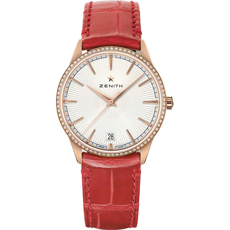 Zenith Elite Classic 36mm Ladies Watch 22.3200.670/01.c831. This luxurious watch features an exquisite 18kt rose gold case paired with a stunning diamond-set bezel, creating an elegant and eye-catching design. The silver dial showcases a beautiful sunray pattern that catches the light, while index hour markers provide clarity and sophistication. A date display at the 6 o'clock position adds practicality to the refined aesthetic. Driven by the Zenith Elite Caliber 670 movement, this timepiece operates at 28,800 vibrations per hour, consists of 144 components, and contains 27 jewels, offering an approximate power reserve of 50 hours. This combination of premium materials and meticulous craftsmanship makes it a perfect choice for those who appreciate fine horology and timeless elegance.