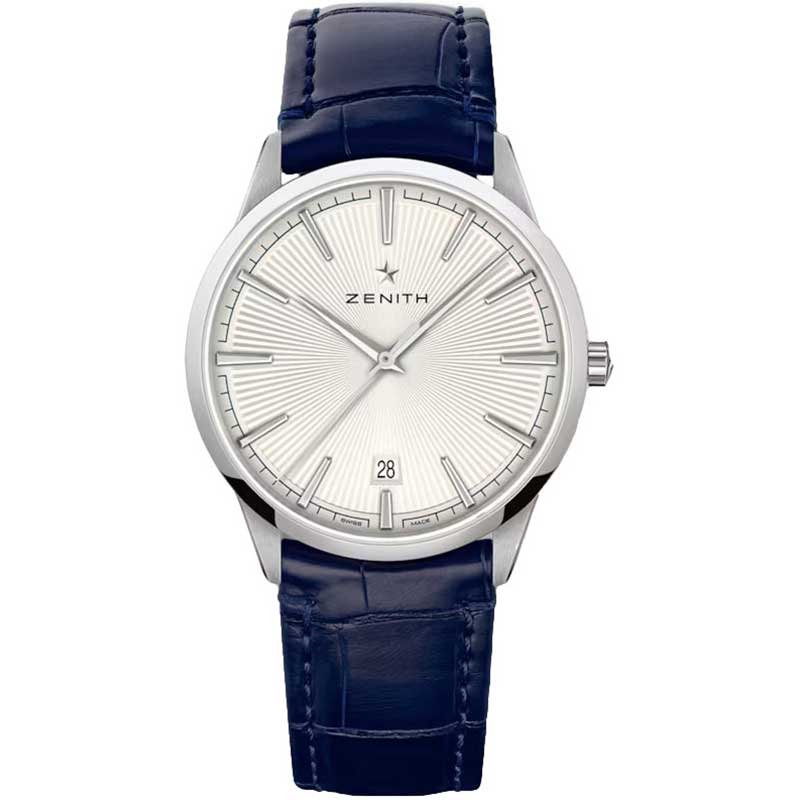 Zenith Elite Classic 40mm Men's Watch 03.3100.670/01.c922. This elegant watch features a polished stainless steel case that exudes timeless sophistication. The silver dial, adorned with a sunray pattern, adds a touch of depth and brilliance, while the index hour markers provide clarity and style. A convenient date display is situated at the 6 o'clock position for practicality. Powered by the Zenith Elite Caliber 670 movement, this timepiece operates at 28,800 vibrations per hour, comprises 144 components, contains 27 jewels, and boasts an approximate power reserve of 50 hours, making it a perfect blend of precision and craftsmanship for discerning watch enthusiasts.