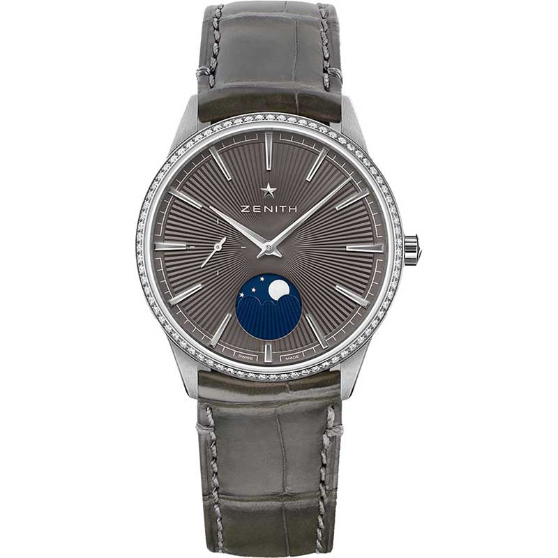 Zenith Elite Moonphase 36mm Ladies Watch 16.3200.692/03.c833. This exquisite watch features a polished stainless steel case paired with a dazzling diamond-set bezel, adding a touch of luxury to its design. The slate grey dial, adorned with a sunray pattern, enhances the watch's elegance, while index hour markers ensure clarity. A captivating moonphase display is positioned at 6 o'clock, providing a beautiful indication of lunar cycles, and a small seconds sub-dial is located at 9 o'clock for precise timekeeping. Powered by the Zenith Elite Caliber 670 movement, this timepiece operates at 28,800 vibrations per hour, contains 195 components, features 27 jewels, and offers an approximate power reserve of 50 hours, making it a perfect blend of function and sophistication for discerning watch enthusiasts.
