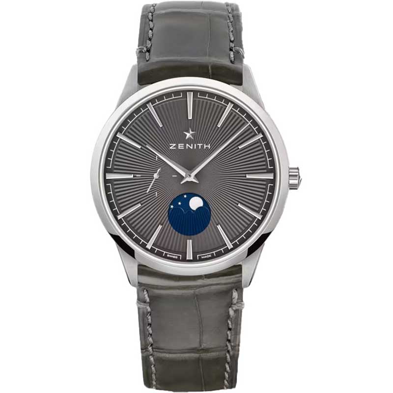 Zenith Elite Moonphase 40mm Men's Watch 03.3100.692/03.c923. This elegant watch features a polished stainless steel case paired with a slate grey dial that showcases a captivating sunray pattern. The applied index hour markers enhance clarity and style, while the moonphase display at 6 o'clock provides a beautiful representation of lunar cycles. A small seconds sub-dial at 9 o'clock ensures precise timekeeping. Powered by the Zenith Elite Caliber 692 movement, this timepiece operates at 28,800 vibrations per hour, contains 195 components, features 27 jewels, and offers an approximate power reserve of 48 hours, making it a sophisticated choice for watch enthusiasts who appreciate fine craftsmanship and functionality.